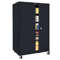 This sandusky lee ca41361872 09 classic series storage cabinet is made of welded steel for strength and has a black powder coat finish for resistance to chipping and corrosion four adjustable shelves two hinged doors and a swing handle with a lock and three point locking system for security.